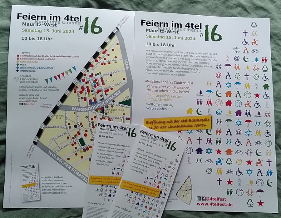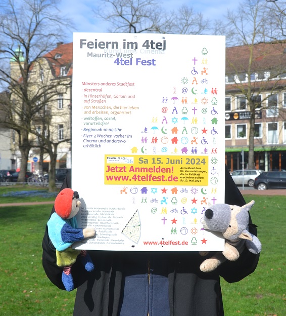 Veranstaltungen und Aktionen wie Musik und Konzerte, kreative und künstlerische Angebote oder Mit-Mach-Aktionen sowie Stände können von allen Anwohnenden im Zeitraum vom 02.04. bis 11.05. über die Homepage www.4telfest.de angemeldet werden. Auf den Anmeldestart machen jetzt schon viele bunte Plakate aufmerksam, die seit diesem Wochenende (23.03.) in den Straßen des 4tels hängen.